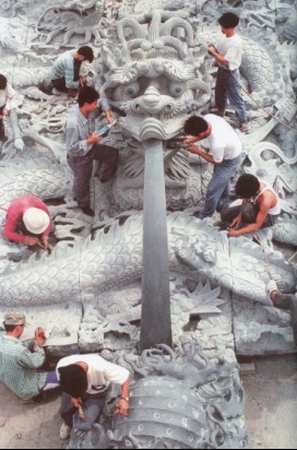 国内雕塑界有“南有惠安,北有曲阳”之说。作为南派石雕艺术的代表,惠安石雕影响了中国石雕艺术的半壁江山,作为区域文化载体,惠安石雕见证了闽南文化悠远的历史渊源。早在明万历年间惠安石雕就已流传到菲律宾,清代中期惠安石雕开始在台湾广为传播,成为闽台交往的重要内容。在闽南文化圈,一些纪念性、标志性建筑,都有异彩纷呈的惠安石雕,诸如历史上的泉州东西塔、台湾龙山寺、厦门南普陀、福州涌泉寺、南安蔡浅古民居,南京中山陵,现代厦门集美鳌园、人民大会堂、毛主席纪念堂、江苏淮安周恩来纪念馆、中华世纪坛、台湾凤山500罗汉、崇武“鱼龙窟”岩雕群,还有马来西亚马六甲海峡的郑和雕像;日本鉴真和尚和那霸市“福州园”等等,不胜枚举。其中,球体直径10米、总重340吨的泉州“鲤鱼化龙”石雕是全国目前最大的镂空石刻圆球,厦门鼓浪屿15.7米高的郑成功塑像是全国最高的人物雕像,福州西禅寺石塔是全国最高的石塔,深圳永福广场19.99米高的白色花岗岩九龙柱被授予“上海吉尼斯世界纪录”,台湾嘉义先天玉虚宫200多平方九龙壁及九龙池更是气势非凡,世所罕见,堪称世界之最!