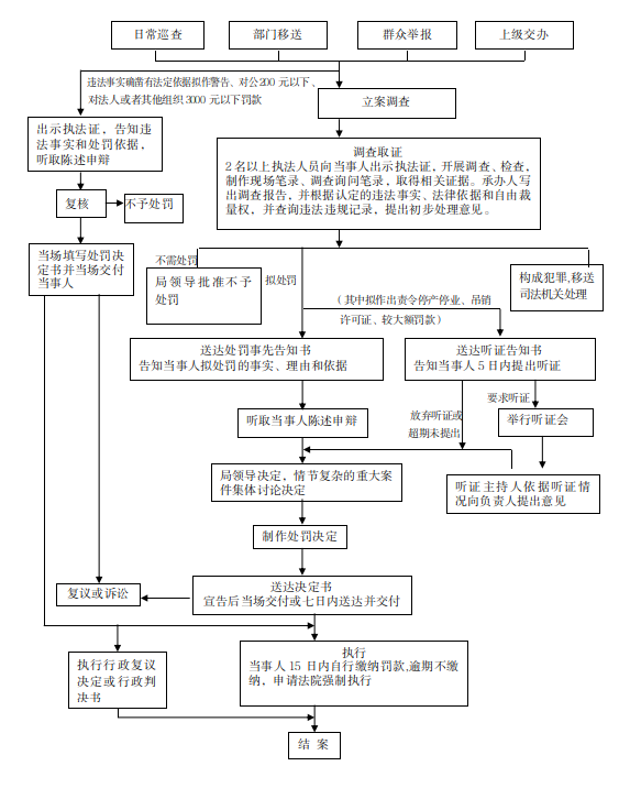 立案→调查取证→处罚告知(告知当事人拟作出的行政处罚内容及事实、理由、依据,并告知当事人依法享有的陈述、申辩、要求听证等权利)→处罚决定审核(重大行政处罚决定应进行法制审核)→负责人审批→作出处罚或不予处罚决定→送达→执行。